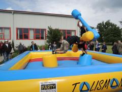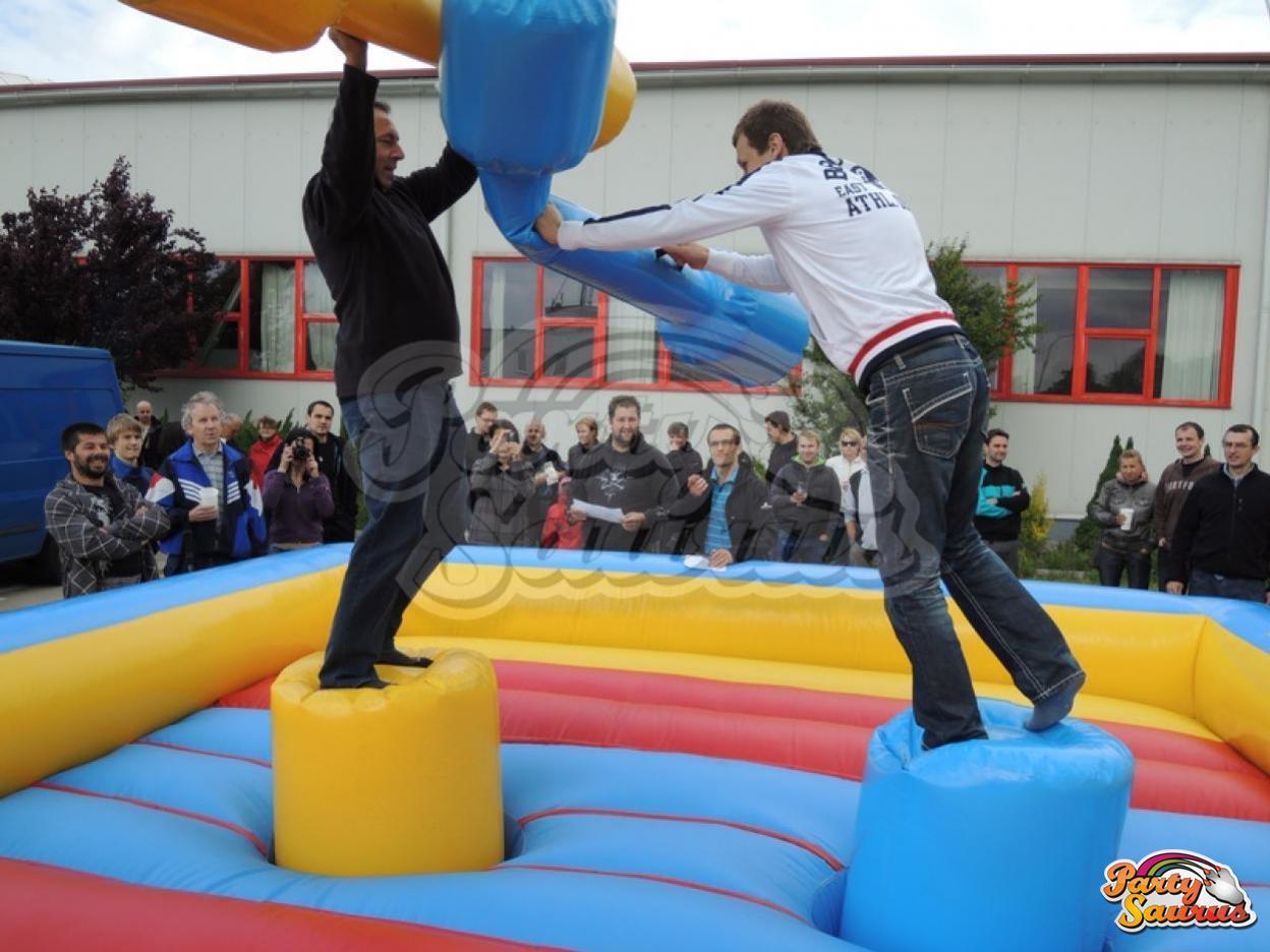 Můžete vyzkoušet svojí dovednost a stabilitu na nafouknutém sudu a pomocí nafouknuté palice schodit spolubojovníka.