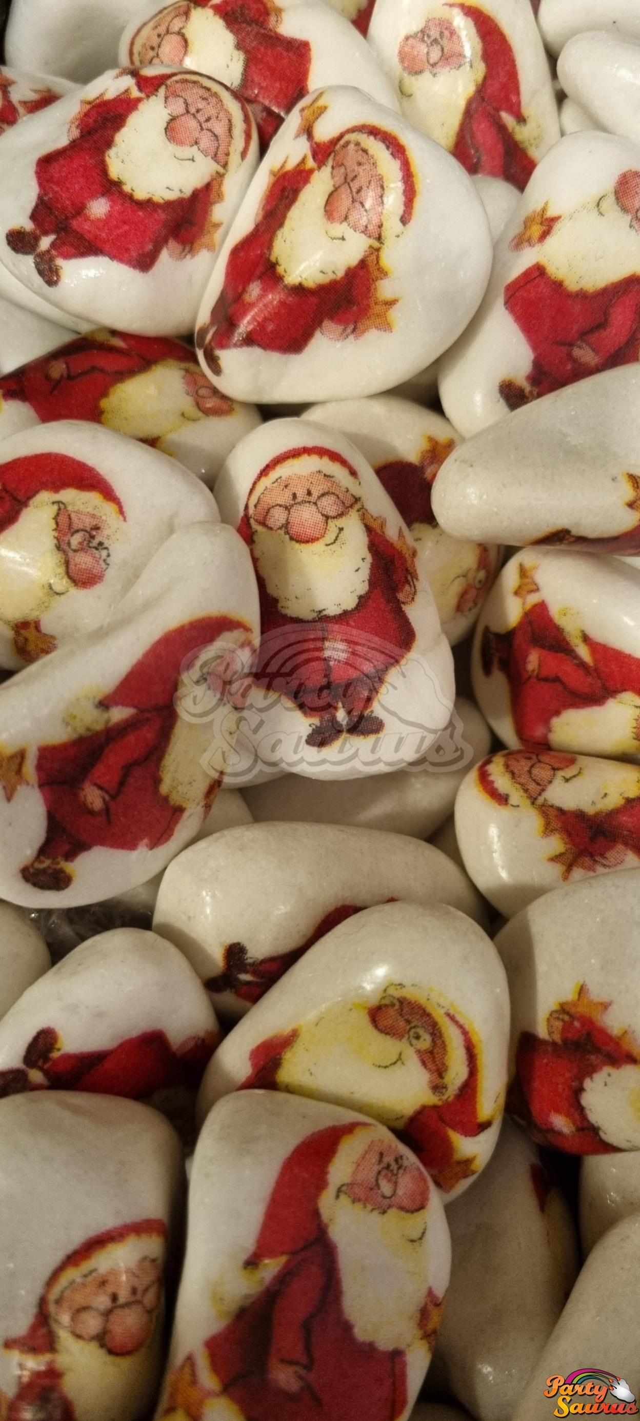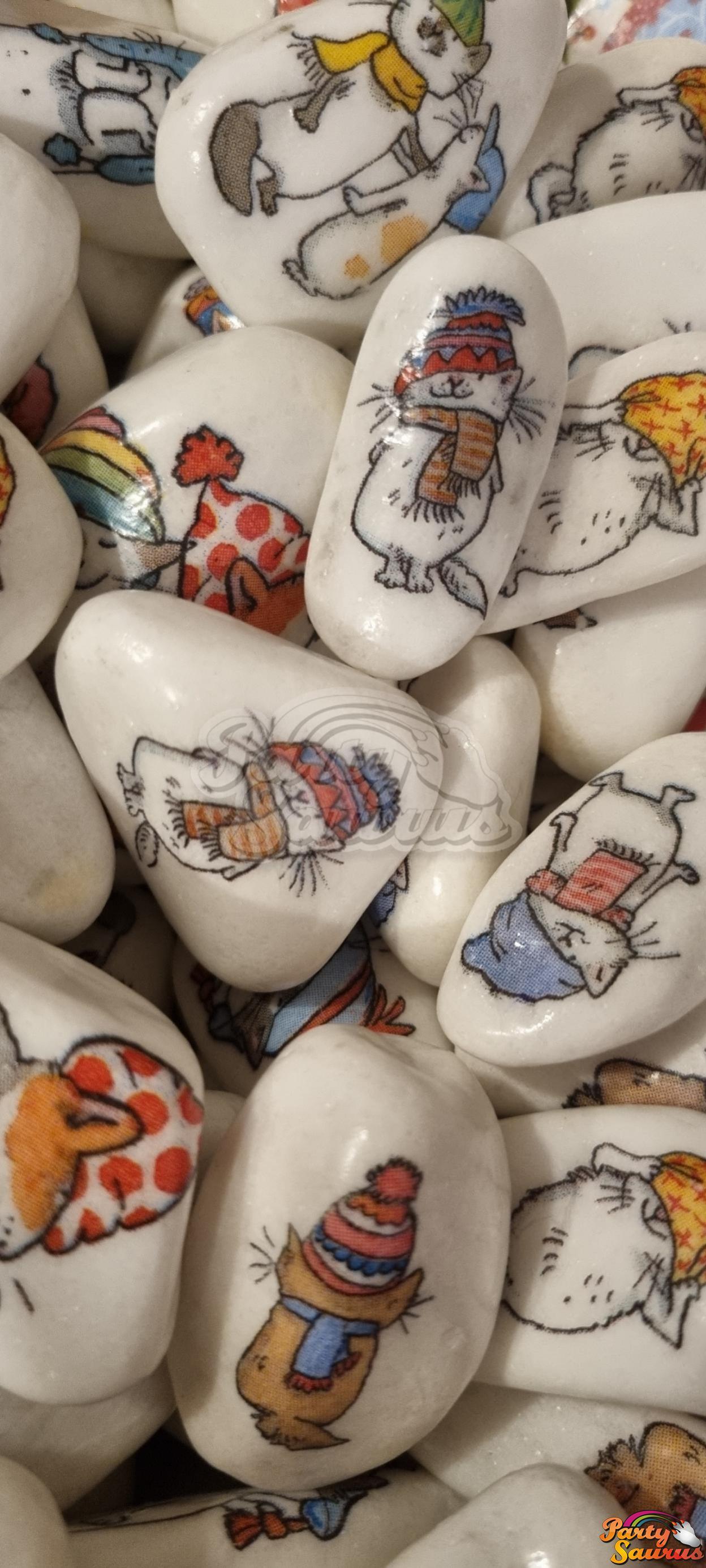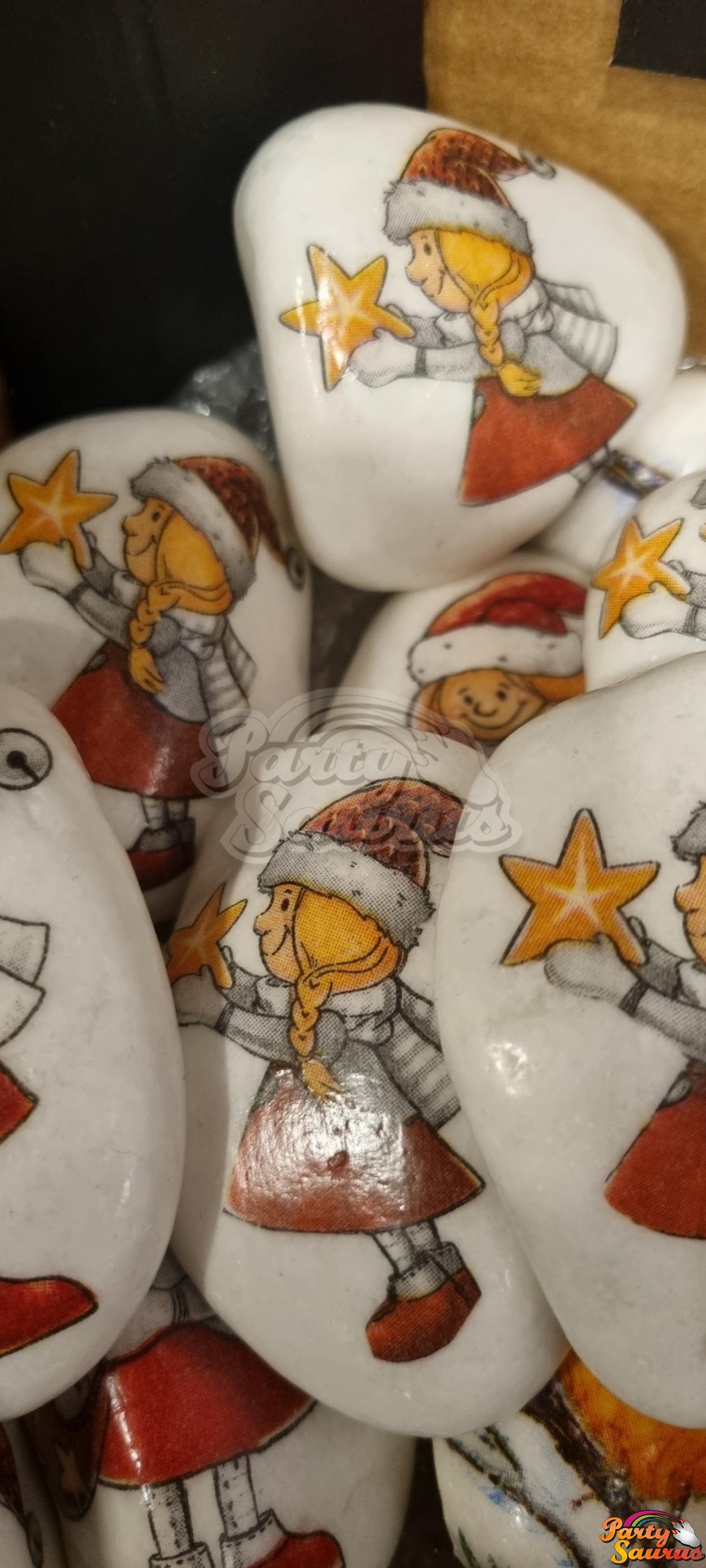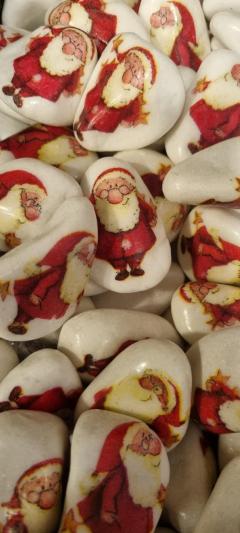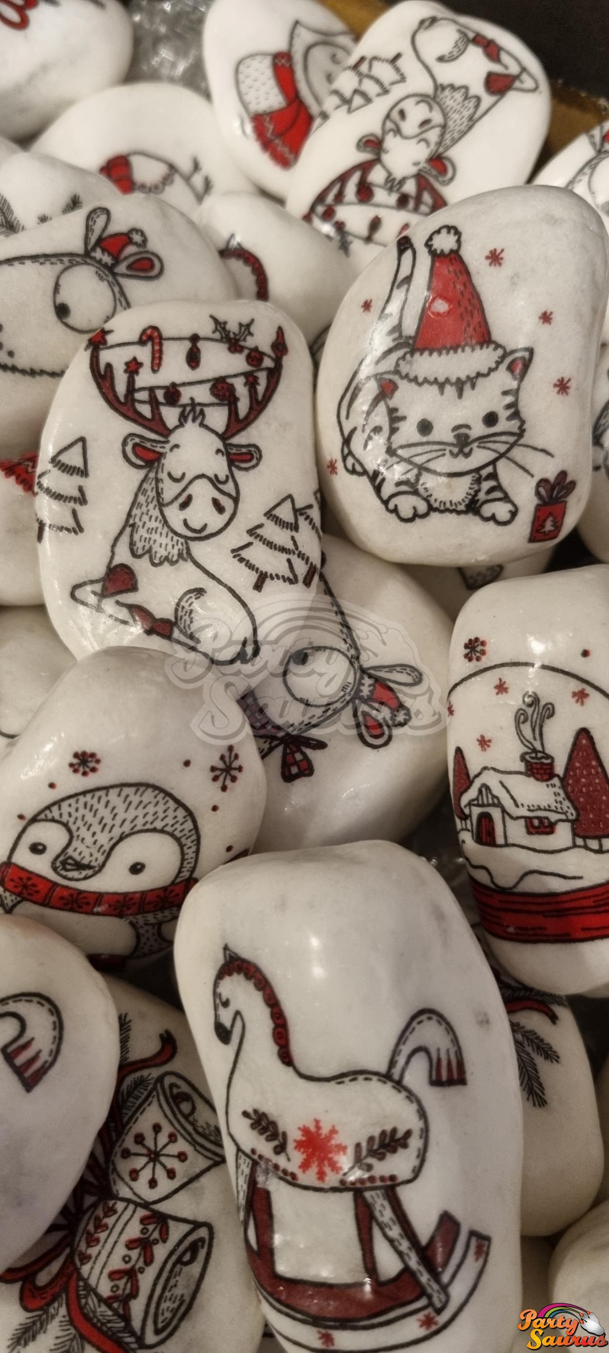 Každý kamínek je ozdoben různými vánočními motivy - obrázky, jako jsou Santa Claus, kočka s čepicí, sovy, holčička, zvonečky nebo perníček .... a děti mohou bílé místo vylepšit dle své fantazie :-) ... barvičkami, samolepkovými kamínky.